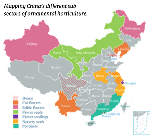 中国花卉协会提供的2018年最新统计数据显示,中国拥有世界上最大的观赏植物种植面积,占地1461207公顷,产值240亿美元。辽宁和云南是主要的切花、切叶和枝条的生产地区,而福建和广东则以盆栽植物为主。江苏和四川以盆景的大规模生产而闻名;黑龙江和新疆主要生产食用花卉;还有河南,江苏和浙江的苗木产品。而上海被称为植物种苗生产的中心,甘肃和内蒙古则以花卉种子生产而闻名。