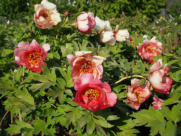 伊藤杂交种的特点是开花迟。这意味着花朵不会像灌木或多年生牡丹那样以相当集中的方式开放,而是会稍微偏移。这将延长花期。偶尔,伊藤杂交种会在夏末继续开花。这些花通常比春天的花多两倍。所有 I 型杂交种在秋季都会长时间保持叶片。伊藤杂交种的特点是非常健康,生长非常旺盛。即使在不适合种植牡丹花的地方,也可以用这组牡丹来种植出迷人的“牡丹花”。