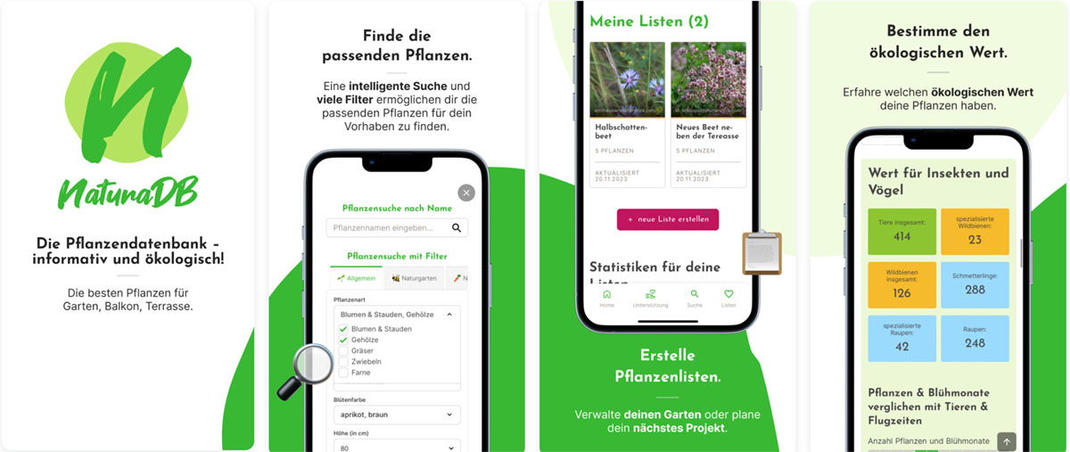 “德国NaturaDB自然数据库APP”可以帮助您找到适合您和您的花园的植物。无论是干燥的石墙还是花园池塘,岩石花园,阳光充足或阴凉的地方,沙质、壤土或富含腐殖质的土壤。您还会发现很多有关植物的有趣信息:可食用还是有毒、它是药用植物、它来自哪里以及它有何特别之处。网站同时提供了大量园艺指南信息。